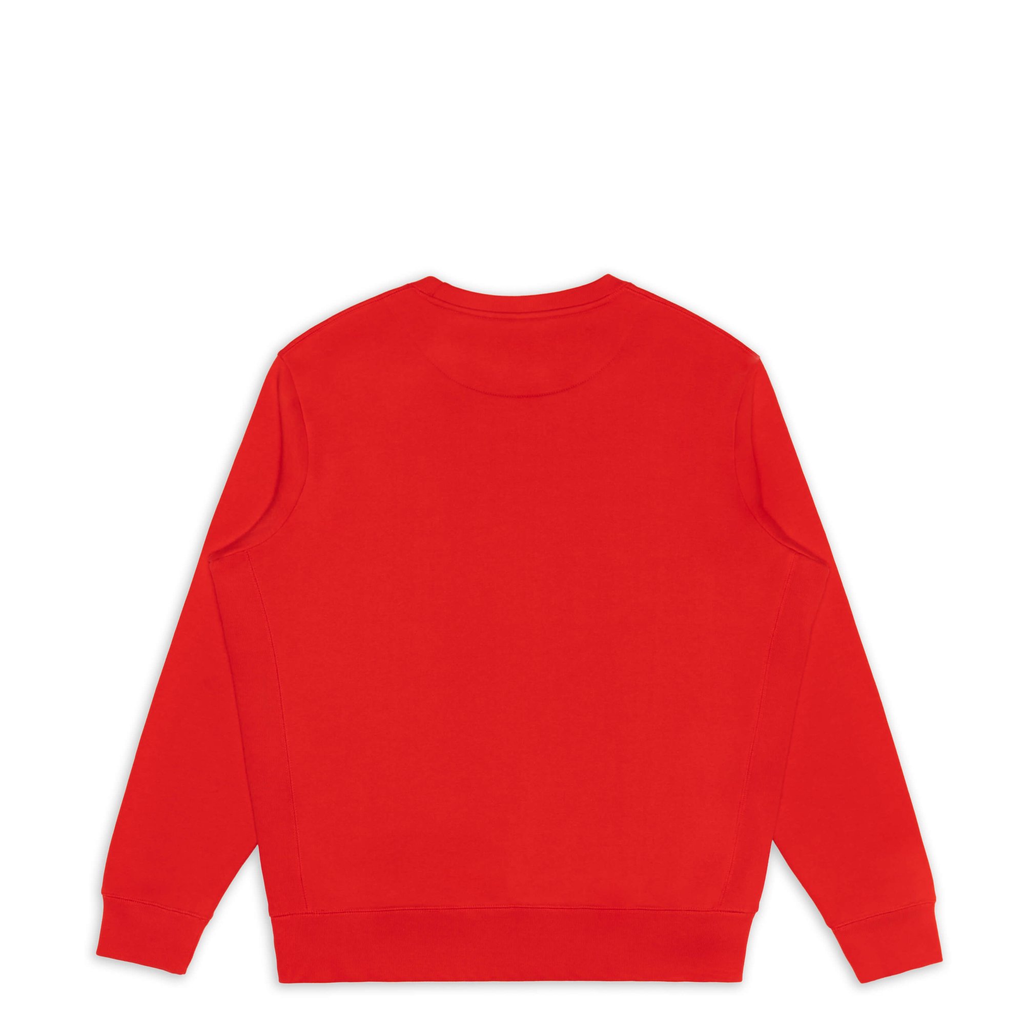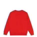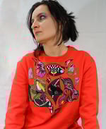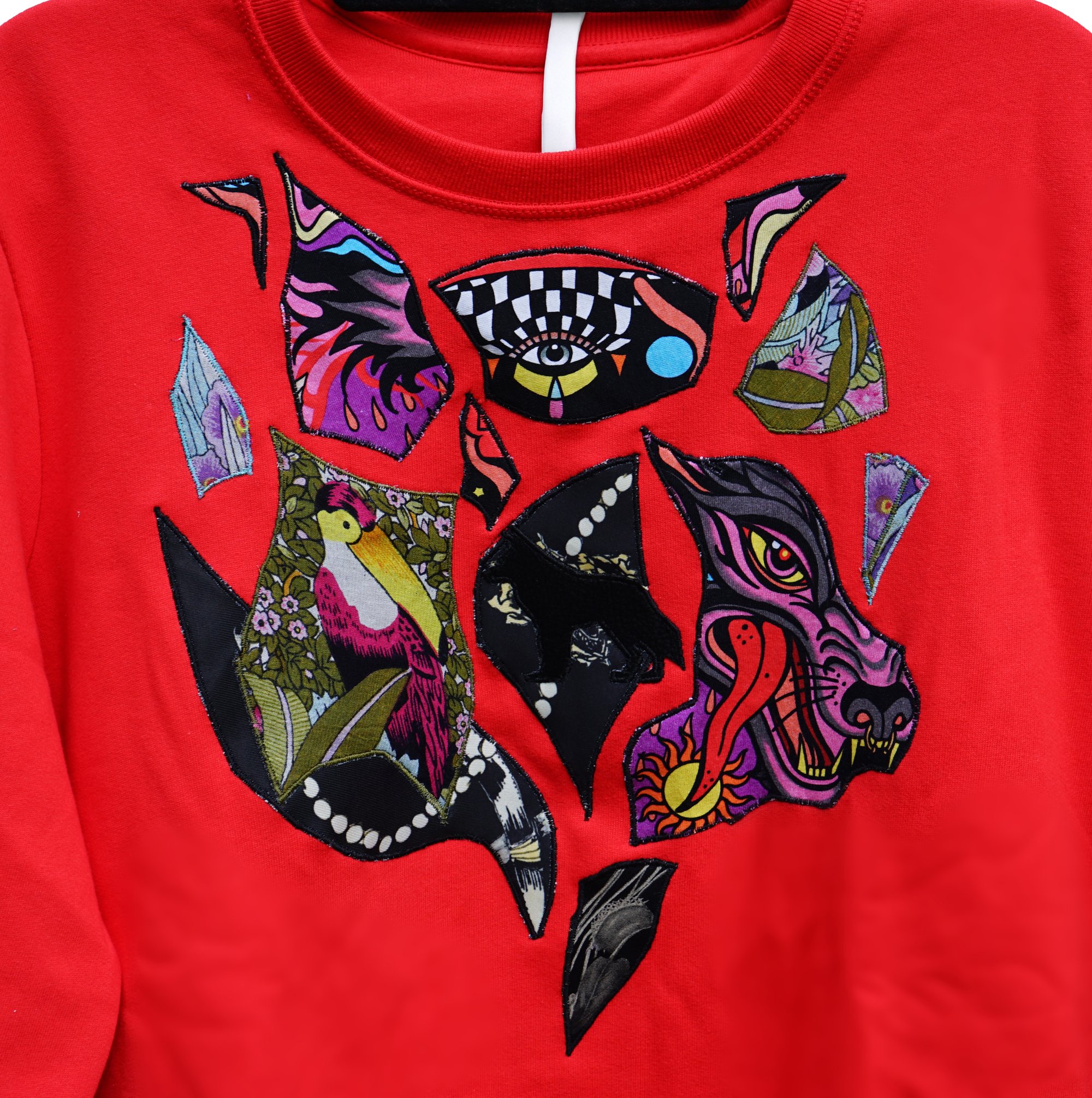 Try not to stand out in this bold, fiery red sweatshirt. You can’t. It’s daring, intense, and full of character. A vivid collage of hand-cut, upcycled fabrics forms a fierce, surreal scene — all eyes, fangs, feathers, and attitude.