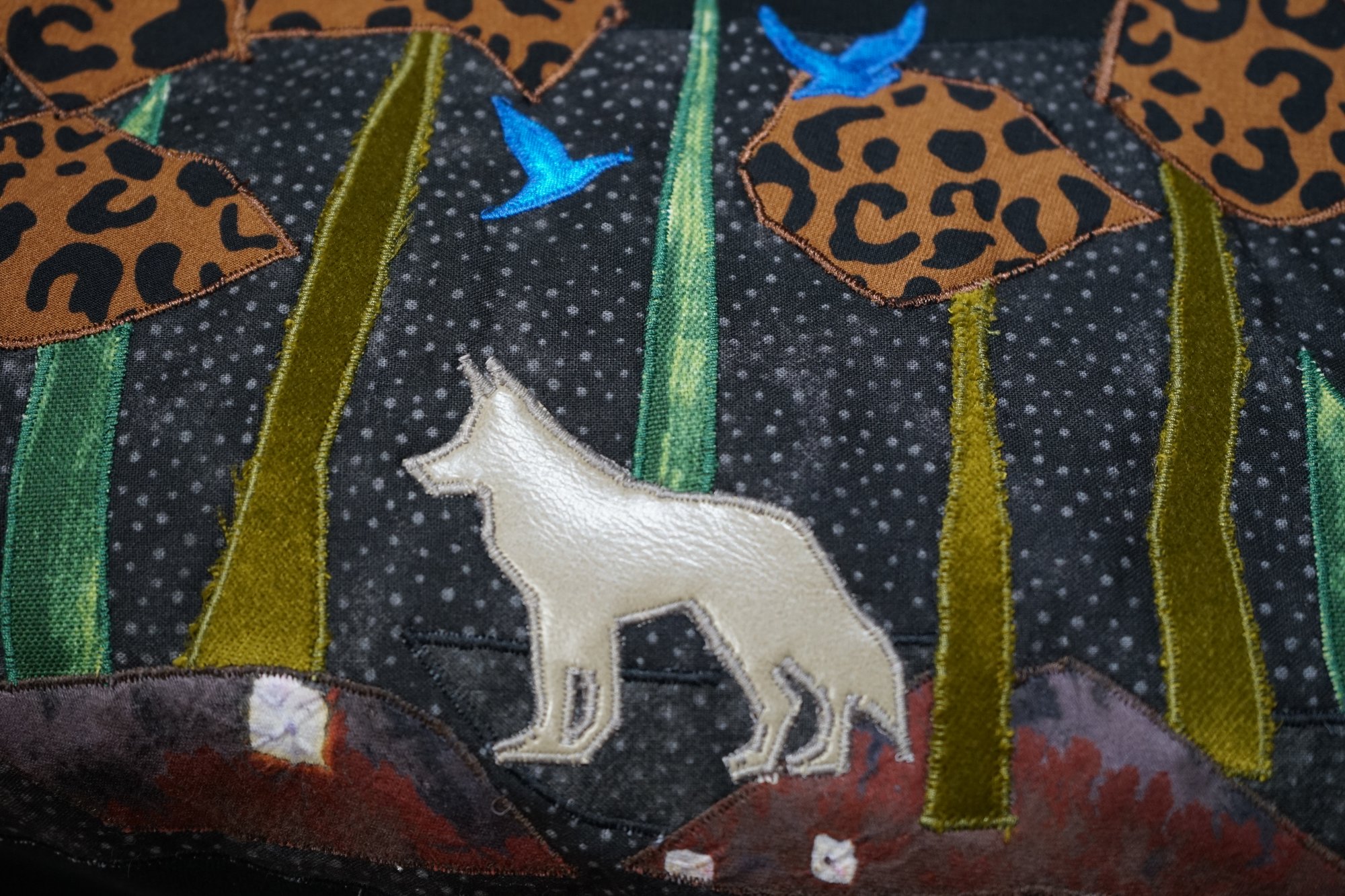 This one-of-a-kind sweatshirt is crafted on heavyweight organic cotton: ultra-soft, warm, and structured to last. The lone wolf, hand-sewn from rescued textiles, moves through a dreamlike landscape of deep green and earthy brown — a tribute to the quiet strength of the wild.